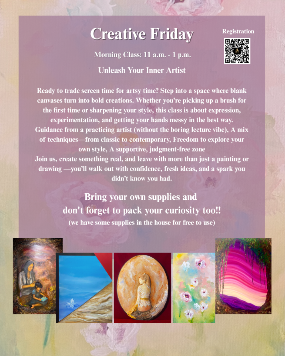 Ready to trade screen time for artsy time? Step into a space where blank canvases turn into bold creations. Whether you’re picking up a brush for the first time or sharpening your style, this class is about expression, experimentation, and getting your hands messy in the best way. Guidance from a practicing artist (without the boring lecture vibe), a mix of techniques - from classic to contemporary, freedom to explore your own style, a supportive, judgement-free zone. Join us, create something real, and leave with more than just a painting or drawing - you’ll walk out with confidence, fresh ideas, and a spark you didn’t know you had.