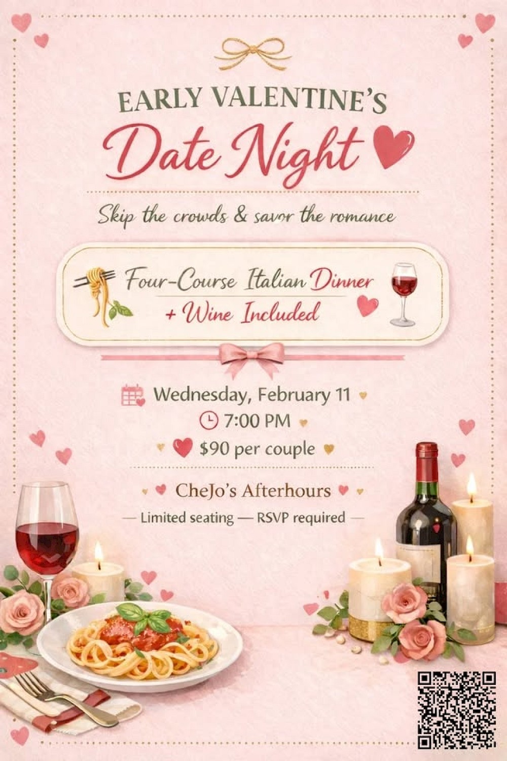 EARLY VALENTINE’S DATE NIGHT at Che Jo’s Afterhours ![]()