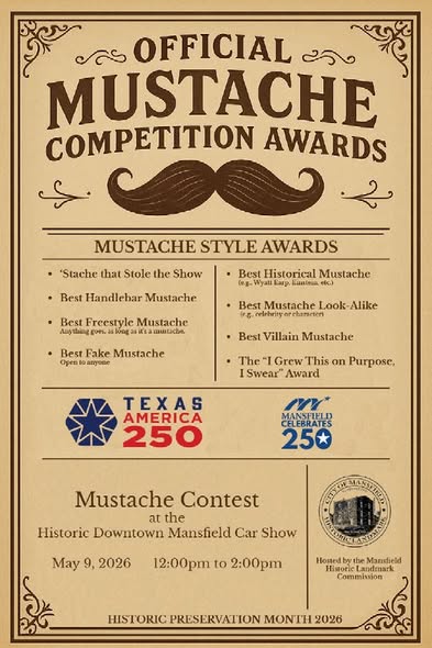 This exciting event honors Mansfield's rich automotive history, with cars a staple in the area since 1906. We invite you to bring your own ride and be part of the celebration in Historic Downtown Mansfield! This year, we also have special awards for the best Americana display and a mustache contest!