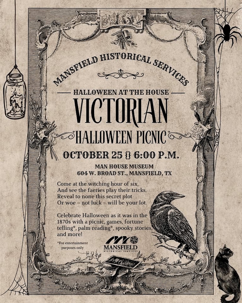 At 6 p.m. on Saturday, Oct. 25, celebrate Halloween as it was in the 1870s with a Victorian Halloween Picnic at the Man House Museum, 604 W. Broad St. Enjoy games, fortune telling*, palm reading*, spooky stories, refreshments, and more! Experience this unique Halloween tradition in your finest costume and prepare for a wickedly good time!