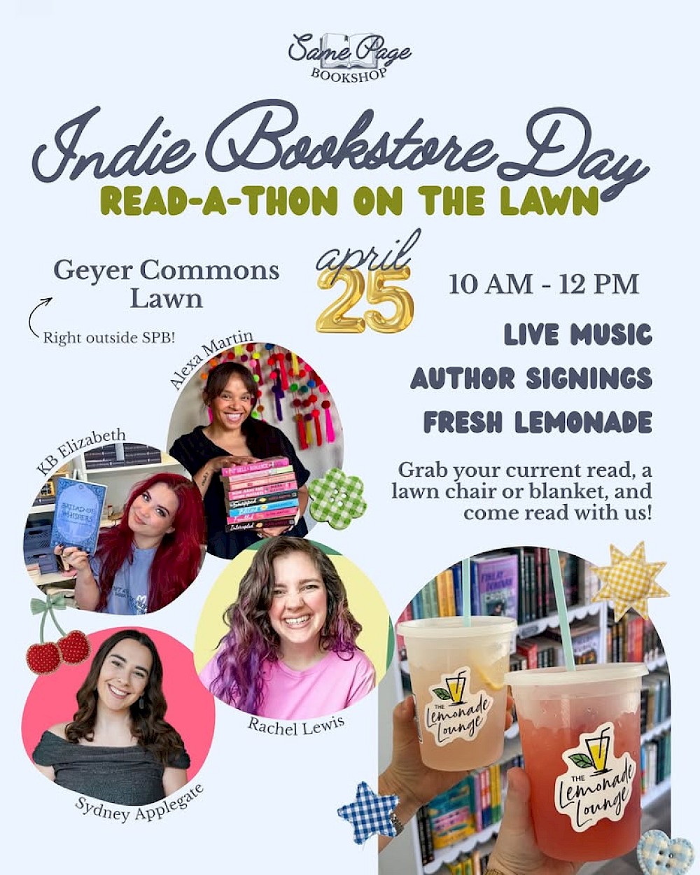 Join us to celebrate our very FIRST Independent Bookstore Day! Come and hang with us at our Read-A-Thon on the Lawn out in front of our bookshop. We will have three incredible local authors, live music, and drinks available from The Lemonade Lounge with specialty bookish drinks.