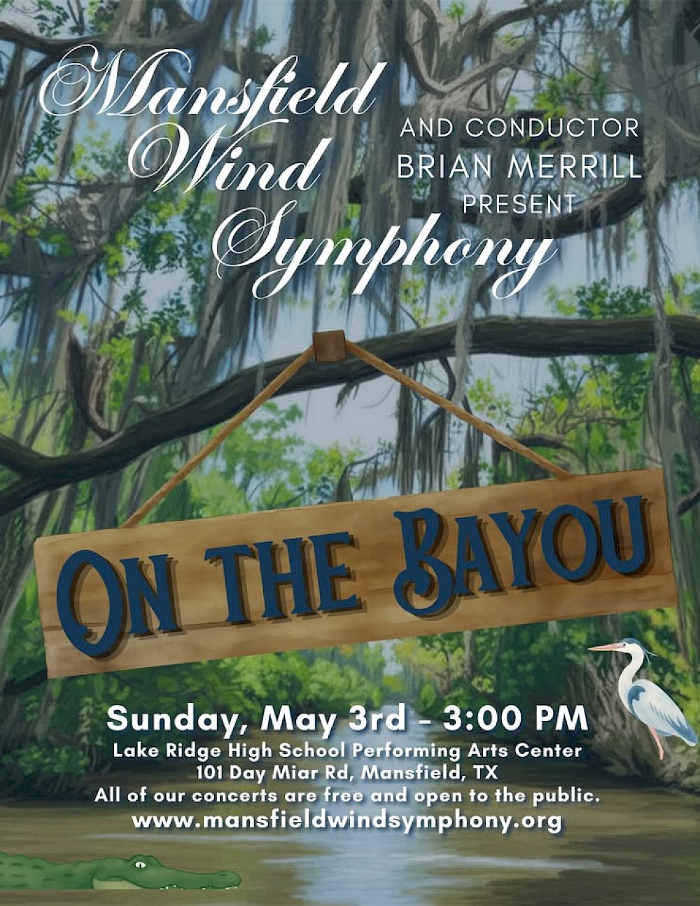Join the Mansfield Wind Symphony as we explore the secrets and mysteries of the murky waters ON THE BAYOU. Featuring the music of Giroux, Grantham, Ticheli and more.