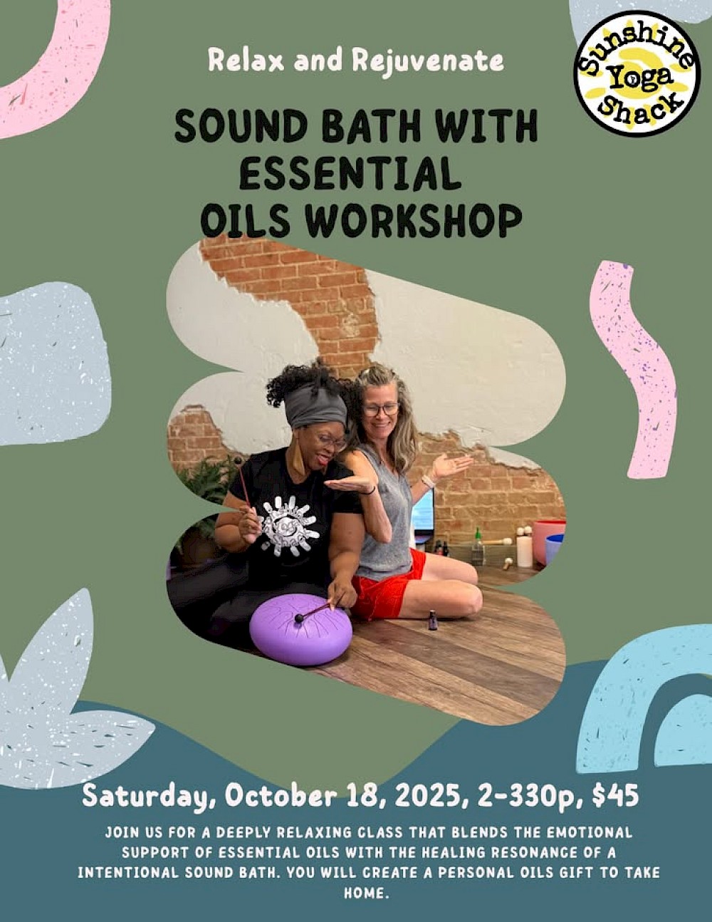 Join Te & Kimberly for a deeply relaxing class that blends the emotional support of essential oils with the healing resonance of a sound bath. You’ll be guided through an intentional sensory journey where carefully chosen oils are shared to support emotional release and balance, followed by a sound bath featuring soothing instruments designed to calm the nervous system and restore inner peace. You will also create a "make & take" essential oil gift to take home with you to use later.