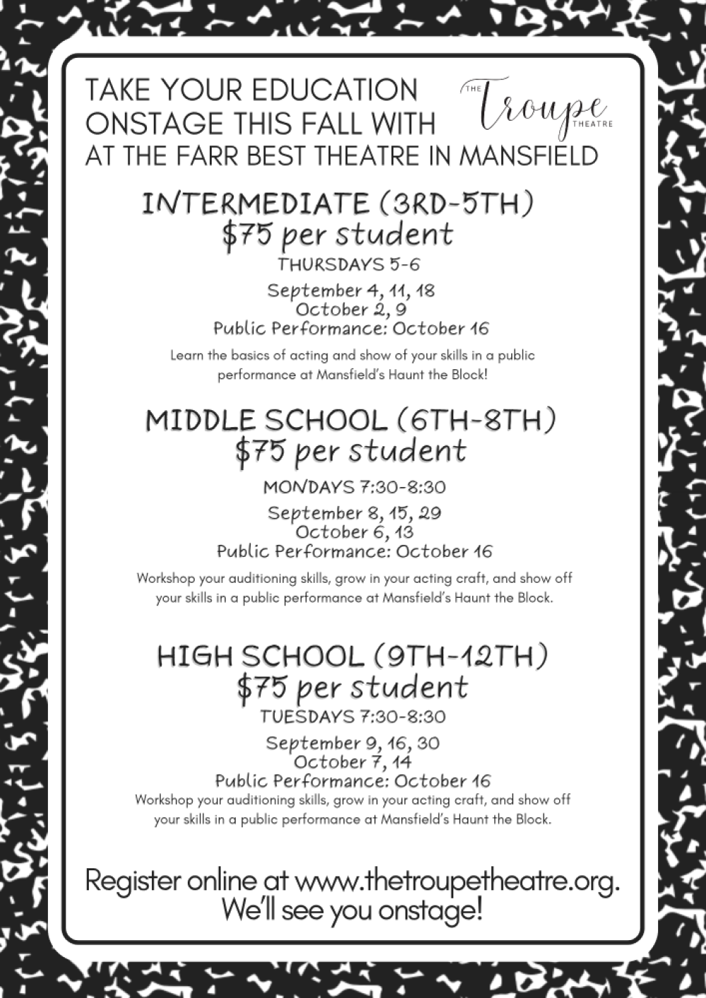 Our elementary/intermediate class is the perfect class to learn and practice various acting techniques and acquaint yourself with the stage. You'll perform a showcase for a public performance in Mansfield's Haunt the Block on October 16.